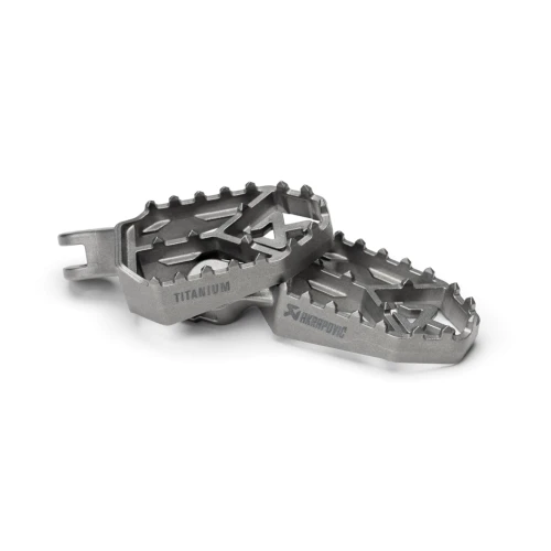 Designing this item completely from scratch, the engineers utilized Akrapovič’s expertise in working with lightweight materials to create a product featuring the unique Akrapovič octagonal design with a Y-shaped reinforcement. The central teeth ensure efficient weight distribution and control from the wide surface with a versatile layout. The footpegs were designed with standing up and heel-down functionality in mind for riders on designated enduro terrain, helping them stay balanced and maintain control and traction when navigating challenging trails.