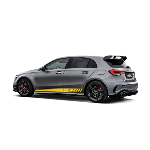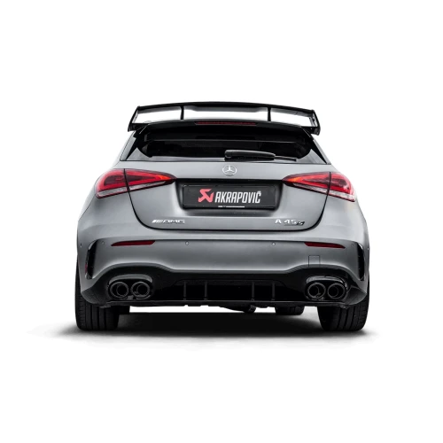 The system is an aural delight for all, with settings ranging from the comfortable everyday car mode, with a smooth sound that enhances the car’s engine tones without any discomfort or drone, to a sporty acoustic experience with deep midrange tones and a rich high-frequency sound at the top of the rev range to elevate the gear-shifting experience, providing amazing crackles at over-run. A different design, build, and configuration from the stock system means the exhaust saves weight and optimizes the engine’s power and torque levels, increasing both throughout the entire rev range, with increases of 6.4 kW at 6,400 rpm and 9.1 Nm at 6,700 rpm as measured in back-to-back runs on the Akrapovič dyno against a Mercedes-AMG A 45 using a standard stock exhaust. The flow path of the exhaust gases provides tuning potential, which can be further enhanced with the addition of the optional Downpipe (SS).