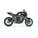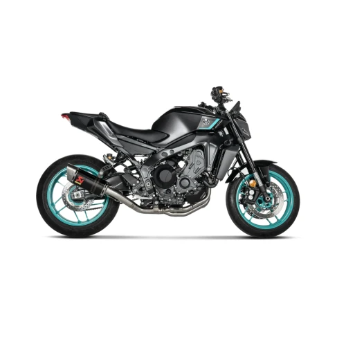 This exhaust has a lightweight carbon-fibre muffler outer sleeve, combined with stainless steel link pipes and headers and finished with a titanium end cap, to produce a system that is 2.6 kg (36,5%) lighter than stock. The new design features a shorter muffler for an enhanced sporty look, which exits on the side of the bike for visual impact. Power is increased by 3.3 kW (4.5 hp) at 9,600 rpm when compared in back-to-back tests on a MT-09 with a Racing Line (Carbon) exhaust and a standard stock exhaust system. The sporty racing sound is perfectly tuned to the engine. It is designed for use on tracks and closed-course competition circuits.