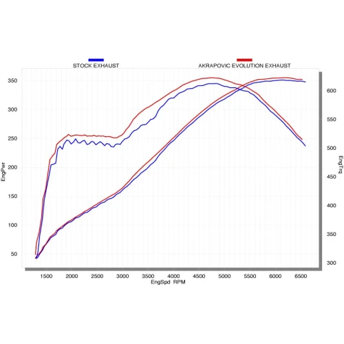 Akrapovic slip-on eksossystem (se bilder 2-4 for detaljer) som tilbyr følgende oppgraderinger: