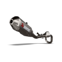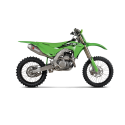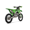 This complete exhaust system is made from lightweight titanium and includes a header with an integrated resonance chamber and a debossed Akrapovič logo on it. It was designed in collaboration with the Akrapovič racing department, utilizing years of experience from top-level off-road racing. The focus during development was on power and torque, with testing carried out on an MX track by a professional test rider to determine the most suitable version.