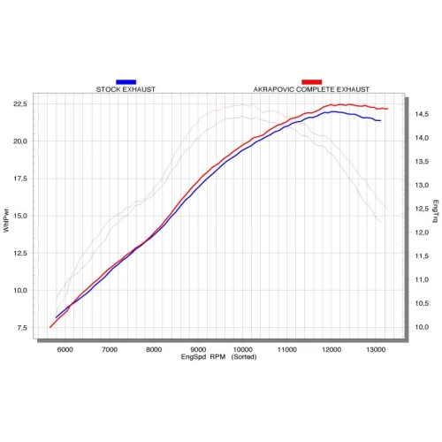 Dette Akrapovic systemet gir jevn effektøkning over stort sett hele turtallsregisteret, med 1 HK økning som mest. Akrapovic anlegget er også lettere enn det originale systemet.