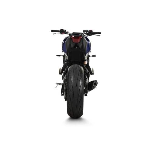 This exhaust has a lightweight carbon-fibre muffler outer sleeve, combined with stainless steel link pipes and headers and finished with a carbon-fibre end cap, to produce a system that is 3.0 kg (41,7%) lighter than stock. The new design features a shorter muffler for an enhanced sporty look, which exits on the side of the bike for visual impact. Power is increased by 1.9 kW (2.6 hp) at 9,100 rpm when compared in back-to-back tests on a MT-07 with a Racing Line (Carbon) exhaust and a standard stock exhaust system. The sporty racing sound is perfectly tuned to the engine. It is designed for use on tracks and closed-course competition circuits.