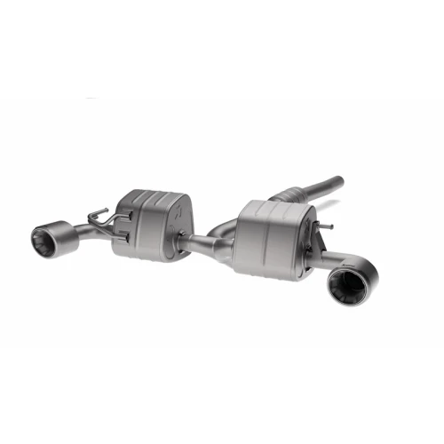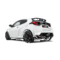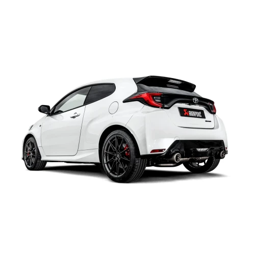 This exhaust is produced using race-proven, high-grade titanium for the entire system and features megaphone-shaped tailpipes. A collector centred between the rear resonators has been cast in the in-house foundry; this collector optimizes and balances the gas flow to produce an acoustically tuned sound with no drone. Three resonators – two at the back of the collector and one in the middle pipe – further tune the sound experience to create a sporty racing tone, fully enhancing the engine’s characteristics with a deep and enthusiastic sound, to give the occupants a feeling of exhilaration that is never interrupted by excess noise. The engineers have placed a special emphasis on the acoustics in the middle and high rev range, with a high-frequency tone at higher rpms and more sound at idle and revving. This sound is managed by two megaphone-shaped titanium tailpipes that are welded to the exhaust and specially coated to resist any colour changes at high temperatures. The shape of the tailpipes influences the sound. They are bigger than stock, measuring in at 110 mm, and have a similar profile to the Akrapovič exhaust for the Toyota GR Supra. Developed to decrease back pressure, the system weighs in at 7,8 kg, which is 37 % lighter than stock and yields power gains of 9.5 kW (12.9 hp) at 6.950 rpm and torque increases of 13.0 Nm at 6,950 rpm when tested on the Akrapovič dyno against a Toyota GR Yaris with a standard stock exhaust. This exhaust is designed for use on racetracks and closed courses only. It is necessary to cut the stock exhaust system when installing this product, but no ECU remapping is needed for this configuration.