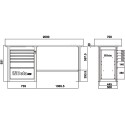 6 drawers (588x367 mm) with ball bearing slides: • 4 drawers, 70 mm high • 1 drawer, 140 mm high • 1 drawer, 280 mm high Main features:  • Worktop made from multiply wood with holes for vice item 1599F/125 (to be ordered separately) • Drawers protected by foamed rubber mats • Hard-wearing nylon drawer front • Roller cabs can accommodate thermoformed trays • Front centralized safety lock • Lower object shelf • Can be fitted with paper roll holder (2400 RSC24/PC) and bottle holder (2400 RSC24/PF-), to be ordered separately. 2000x900x700 mm