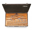 assortment of chrome-steel taps and dies, UNC thread, and accessories in wooden case