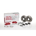 Complete braking systems, comprising components derived from the world of motorsports and offering unrivalled levels of technology on the market. They feature aluminium radial-mounted fixed calipers, with opposing pistons. Depending on the type of system and the required performance level, the calipers can either be in two-parts, monoblock or even monoblock machined from solid billet metal. The uprated brake discs can be integral (one-piece) or composite, drilled or slotted.