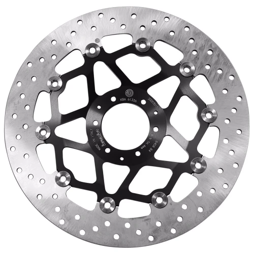 Floating discs are made from only the highest quality materials available to deliver unparalleled performance. These consist of a braking rotor in stainless steel, connected by 10 fastener screws to a CNC machined anodised aluminium alloy housing. Drawing from its immense experience, Brembo has defined the optimum geometries, tolerances and dimensions for each motorcycle type and application. As a result of specific studies into process and machining tolerances, Brembo brake discs have a unique conformation that transfers braking torque more effectively while also improving resistance to thermal and mechanical stress.