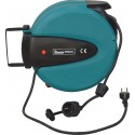 Kraftig kabeltrommel med gummikabel utstyrt med jordede koblinger i begge ender. Maks. belastning: 250V 16A. Utstyrt med overbelastningsvern.