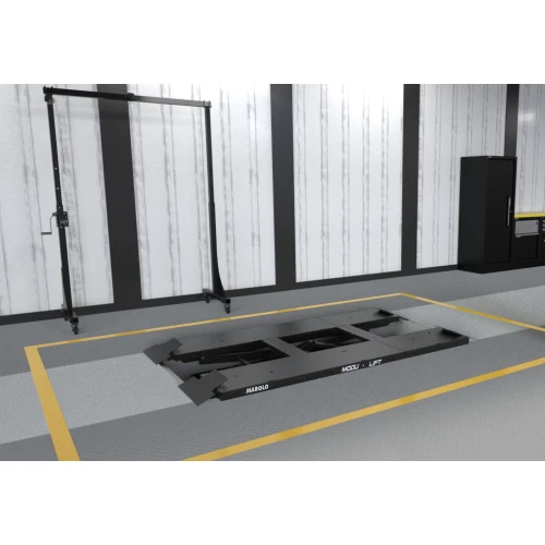 Hydraulisk løftebord, utstyrt med den patenterte MODULIFT-teknologien, som gjør det mulig å løfte kjøretøy med 2, 3 og 4 hjul. Denne robuste plattformen gir enkel tilgang til kjøretøyet, samtidig som den sikrer høy effektivitet og trygghet under løfting.