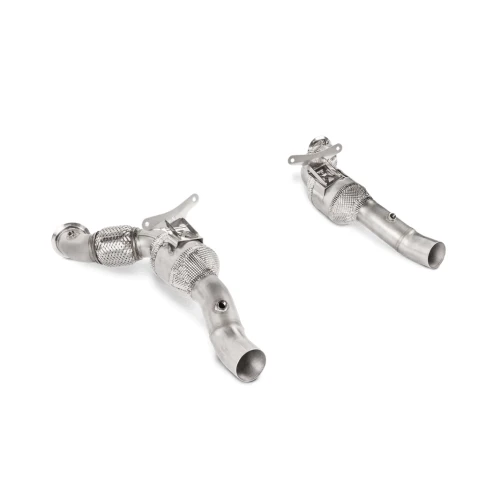 Link pipe set w/o Cat (SS) was tested and developed together with Slip-On Line (Titanium) system.Featuring 200 CPSI high-flow high-quality metal cats and larger insulated tubes. The set increases performance due to less restricted flow through the cats and lowered backpressure, resulting in increased power. Sound levels will also be enhanced, with an increase of 10 dB in external sound performance, emphasizing the character of the engine to provide more of the traditional V8 flat crank feel. When fitting the optional link pipe set with catalytic converters, remapping the car’s ECU is necessary.This product has been developed in combination with our Slip-On Line MTP-FE488H. THIS PRODUCT DOES NOT MEET EMISSION COMPLIANCE REQUIREMENTS FOR STREET OR HIGHWAY USE.