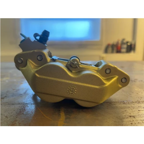 Brembo's klassiske gullfargede (Goldline) 4-stemplede kaliper med avstand mellom festebolter på 40 mm. Denne er for høyre side. Leveres inkludert bremseklosser 07BB15xx, hvilket i seg selv er en betydelig kostnad.