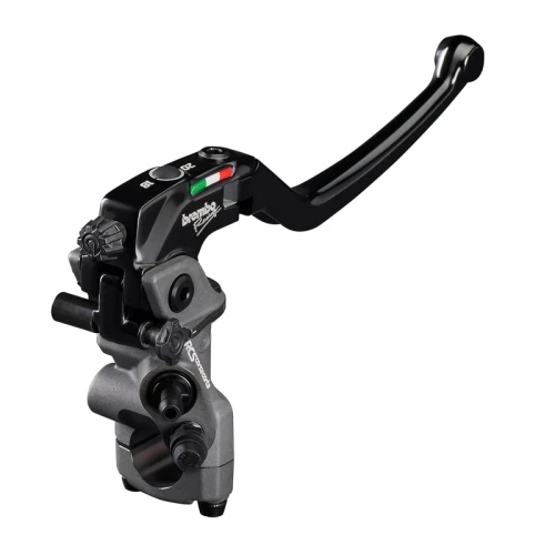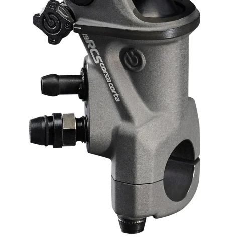 The master cylinder body is made of forge aluminum alloy, machined with 5-axis CAM technology. A hard oxide coating is used for the surface finish, which guarantees that the master cylinder main body is highly resistant to wear and its components move easily. The floating piston and the seals derive directly from those used in MotoGP, as do the housings for the bleeding and fueling systems, which are inclined by more than 30° to make bleeding the master cylinder easier. A study was conducted for the design of the 19RCS CORSA CORTA in order to find consistency of style between all the components of the master cylinder, which now has a distinct, dynamic and sporty look in line with the style of the bikes for which it was conceived (model or design filed simultaneously with the filing of the patent on the technological solution). The lever assembly can be replaced without disassembling the RCS system (Ratio Click System) from the master cylinder and this allows the calibrations made in the installation phase to be maintained unaltered.