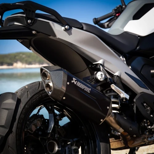 Akrapovic har utviklet ulike eksosvarianter til denne storselgeren fra BMW. Her som E-godkjent svart slip-on i svarteloksert titan med håndlaget karbon endelokk.