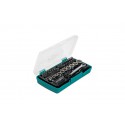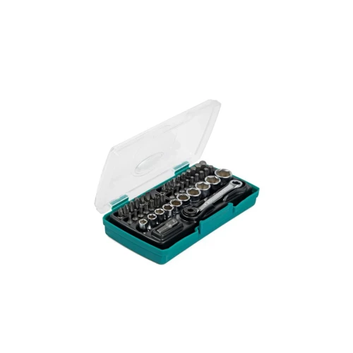 Kompakt sett med 1/4" piper og bits i tommer, inkludert miniskralle med 60 tenner. Miniskrallen gjør det enklere å komme til alle typer skruer og bolter. Mål: 165 x 90 x 35 mm.