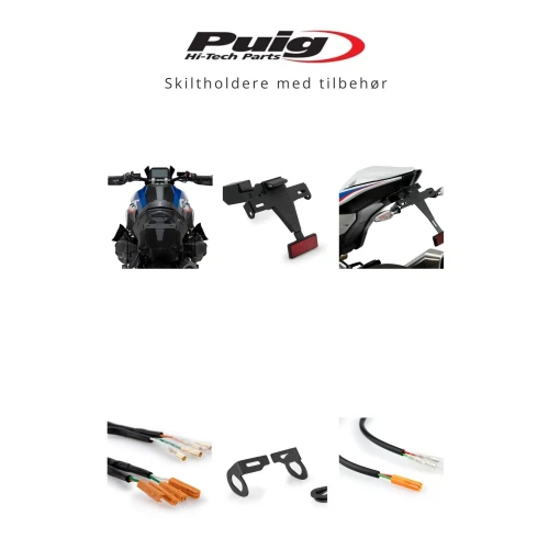 Sortimentet omfatter faste og justerbare skiltholdere, ofte lettere og mer kompakte enn originalholderen. Mange modeller har justerbar vinkel, Tilbehør og reservedeler gjør det enkelt å tilpasse løsningen til motorsykkelen.