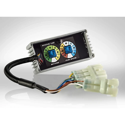 PLUG&PLAY EASY RIDING! Rapid Bike EASY add-on electronic module is equipped with a microprocessor managing directly the lambda sensor signal to optimize the air/fuel ratio, improve the engine efficiency and eliminate the torque and power gaps typical of the low and medium rpm. SIMPLY PLUG & PLAY! Install your EASY module to the stock lambda sensor connector and check for operating status thanks to a led. Now you are ready for the module fine-tuning: this is a very simple procedure (using two easily accessible trimmers) without any need for additional software operations. EASY add-on module can manage up to two lambda sensors, and it is designed especially for motorbikes with a standard configuration. IMPROVE POWER DELIVERY WHILE KEEPING FUEL CONSUMPTION UNDER CONTROL! AIR FUEL RATIO Compared to the stock version (in blue color), RapidBike EASY (in red color) gains a higher speed keeping the same throttle opening, while placing the lambda sensor value in the ideal range between 13,5 – 14,5 AFR