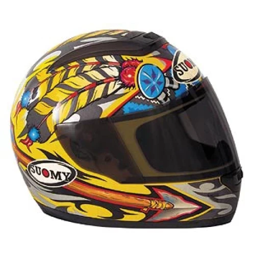 Suomy's testvinner blant mellomklassehjelmene. Påkostet polykarbonat skall med komfortabel og støydempende polstring. Leveres med grafikk eller som ensfarget sølv met./svart. Hurtigspenne på hakereim. Topp passform. Lav vekt.